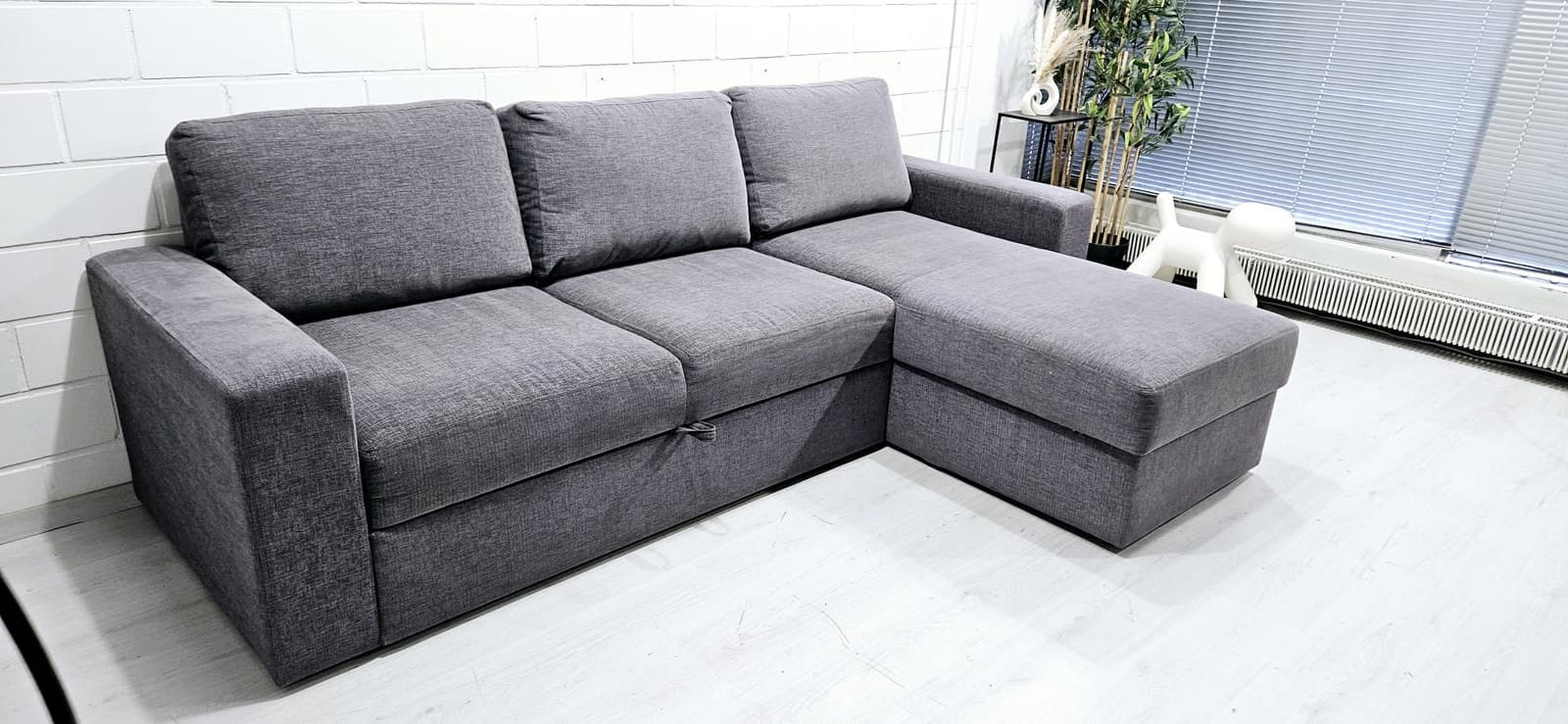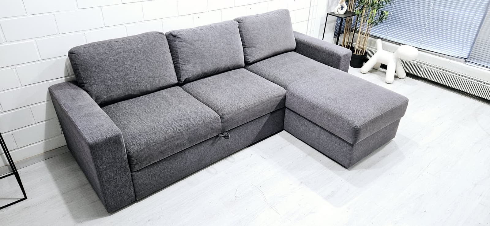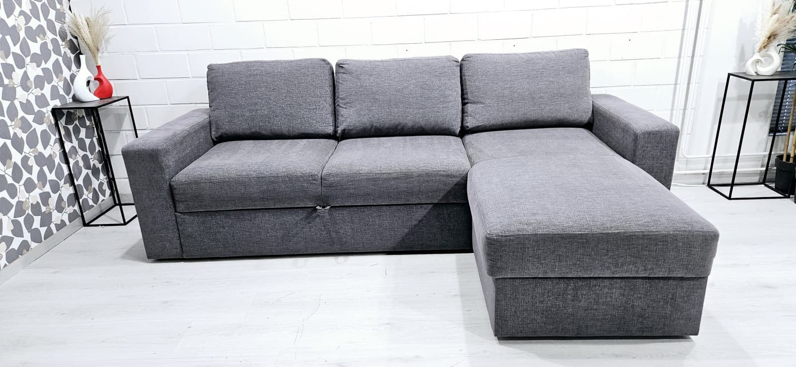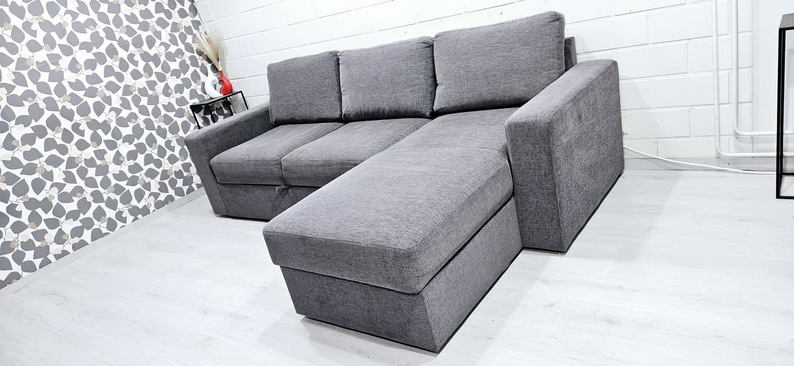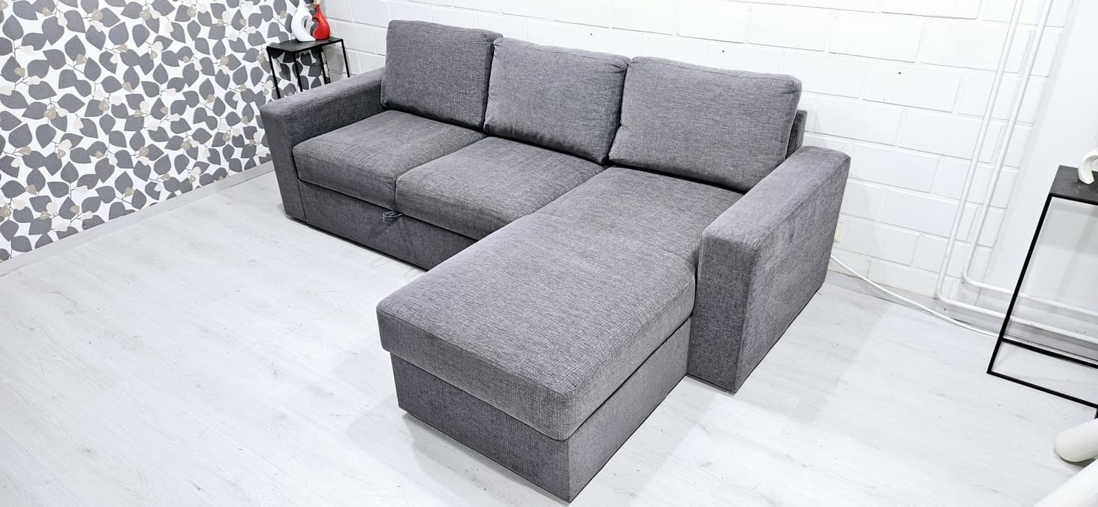 Sohva on hyväkuntoinen. Juuri pesty runkoa myöden. Runko on tukeva. Divaanin alla on säilitystila. Savuttomasta asunnosta ( ei tupakoitu sisällä). Divaanin puolta voi vaihtaa. Leveys 250cm syvyys 90cm divaani 155cm vuode 140x200cm. Kivijalkaliikkeemme on auki VAIN sopimuksen mukaan. Halutessasi viemme vanhat huonekalusi pois korvausta vastaan. Ilmainen kuljetus alueille: Helsinki, Espoo, Vantaa, Kerava, Järvenpää, Tuusula. Kuljetukset myös muualle edullisesti, kysy rohkeasti hintaa! Ilmainen kuljetus free delivery sohva divaanisohva kulmasohva moduulisohva sofa cornersofa modularsofa delivery kulmadivaanisohva corner sofa tuonti